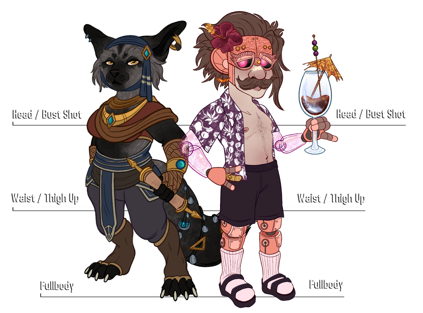 Sheets that show off a character’s most important assets such as markings, proportions, etc. Can display basic character information as well in the form of written text. Will be drawn in my style as a default, but toony sheets or simple sheets intended for use by plush / fursuit makers can also be requested.